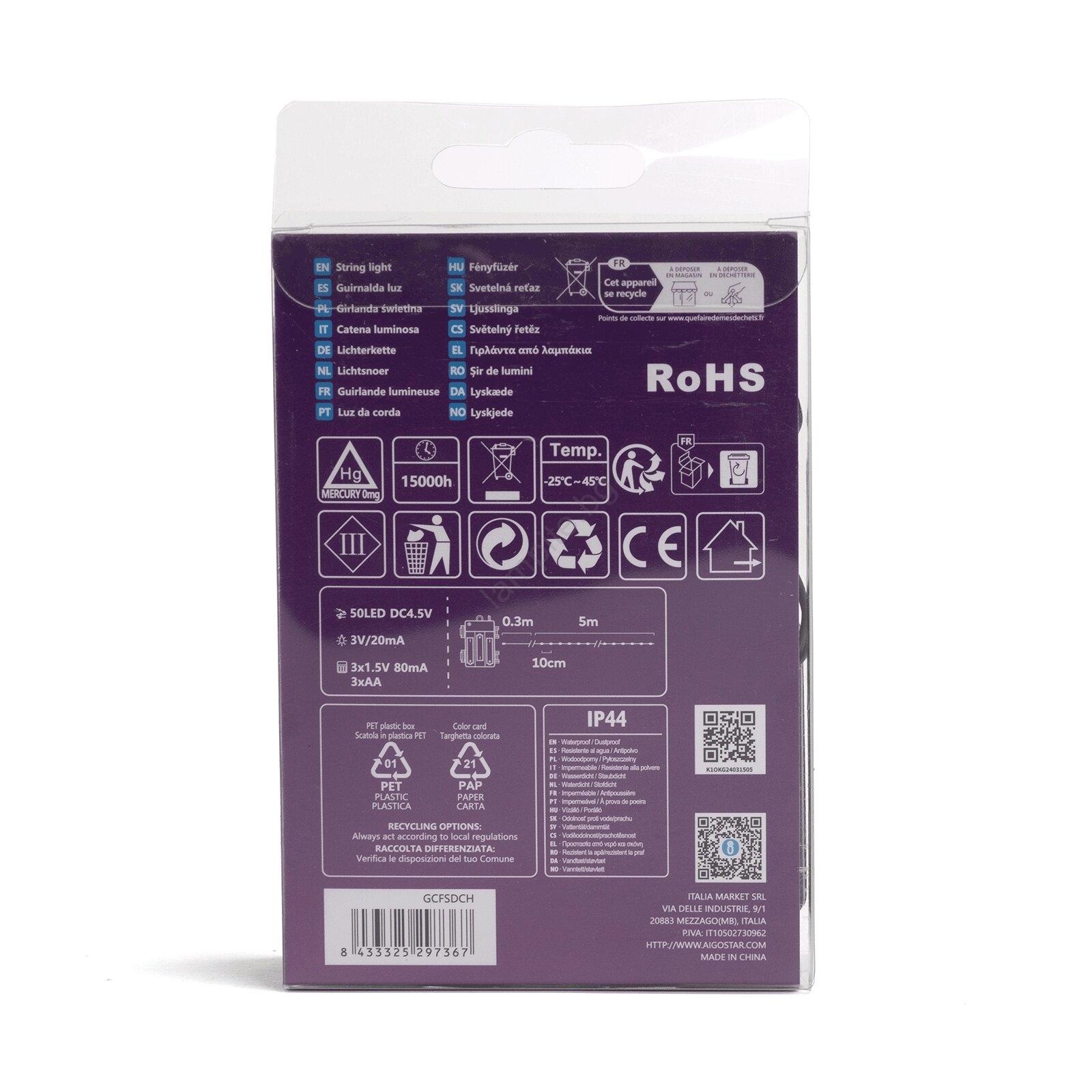 • Aigostar - LED външна гирлянда 50xLED/8 режима 3xAA 5,3m IP44 многоцветна