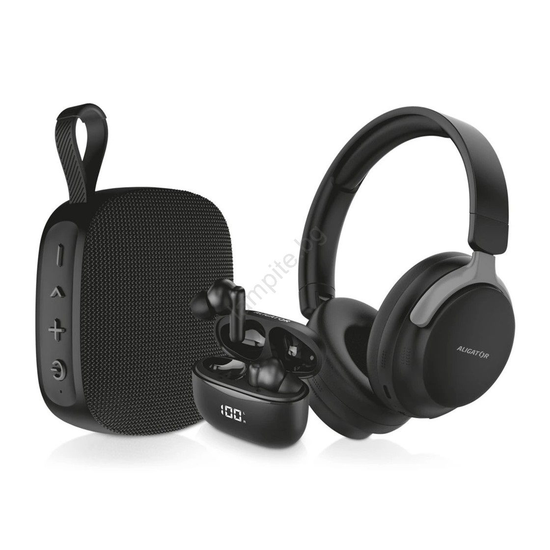 Aligator AUC001 - аудио комплект 3 в 1: над-ушни слушалки 150 mAh, безжични слушалки 200 mAh + 2x 30 mAh и преносима колонка 1200 mAh