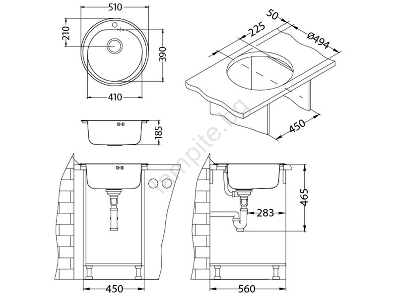 • Съдържание на опаковката: мивка от неръждаема стомана, скоби и уплътнения, ситов вентил 3 1/2, сифон с отклонение за съдомиялна машина.