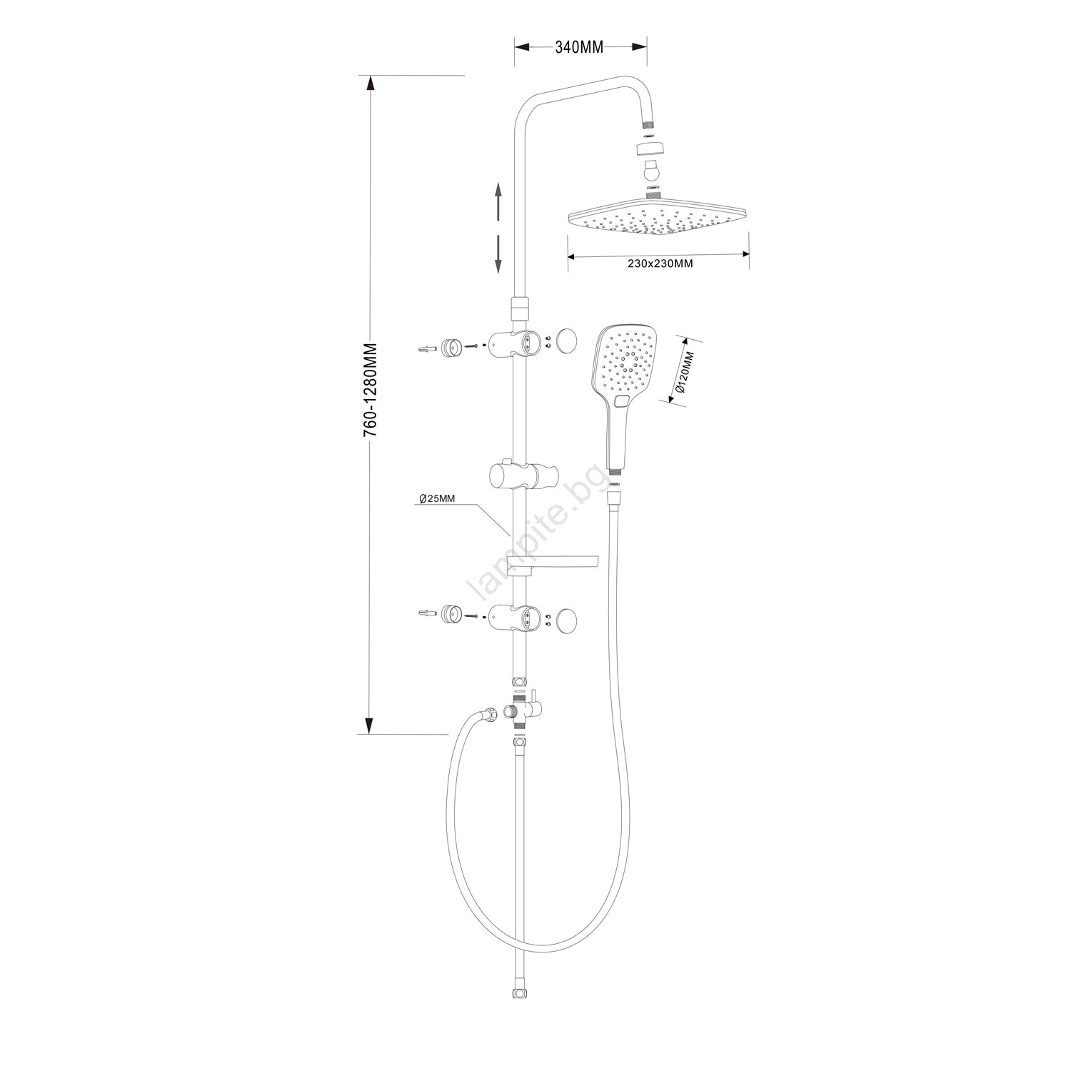 • Опаковката включва ръчен и главен душ, държач за ръчен душ, сапунерка и маркуч.