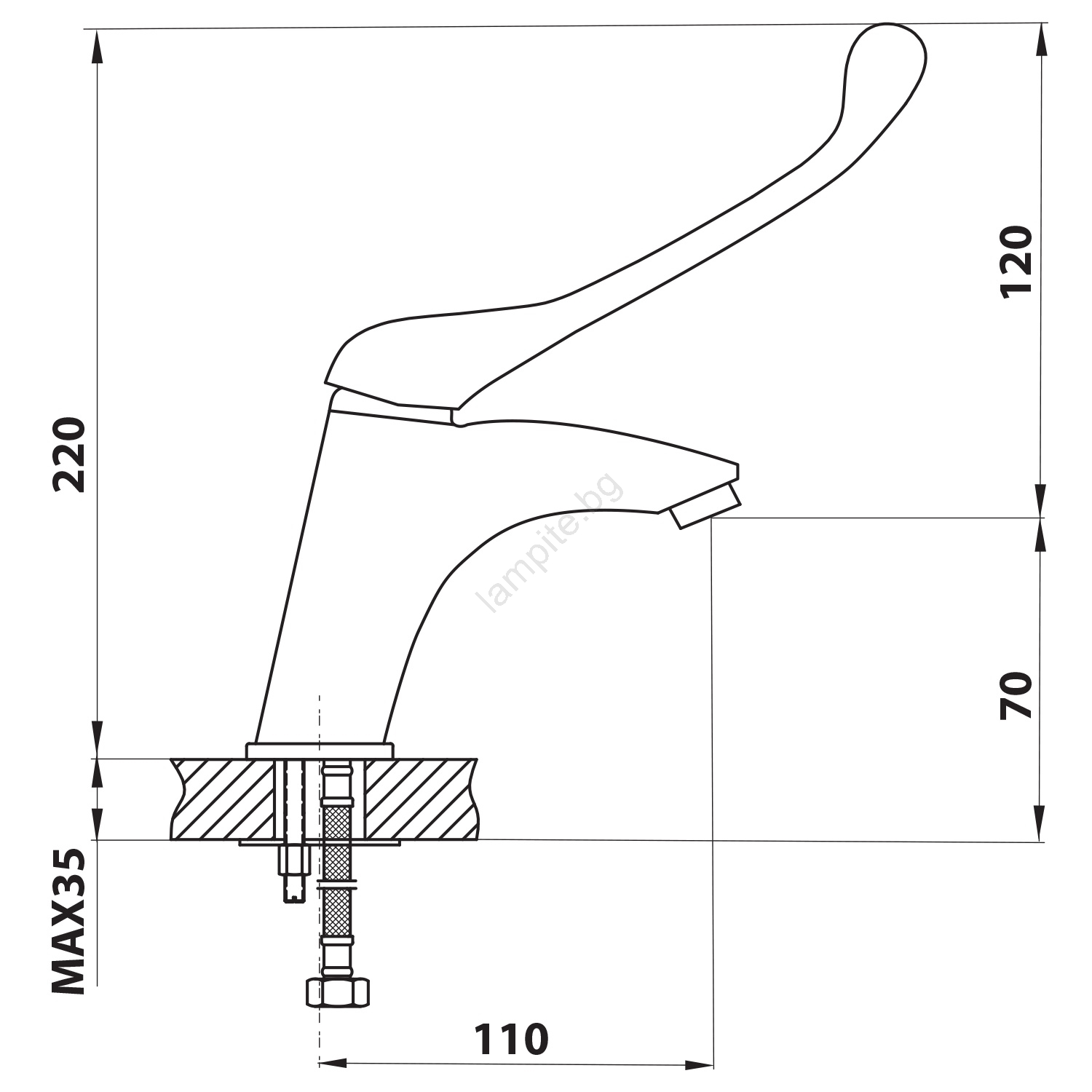 • Стоящ смесител за умивалник, предназначен за медицинска употреба.