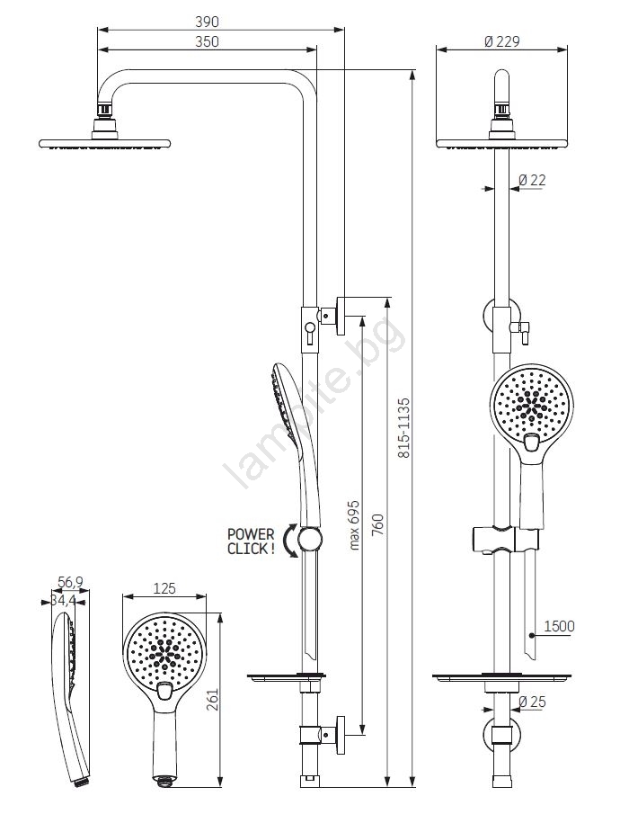 • Душ-рейката и горният душ са изработени от неръждаема стомана с PVD покритие.