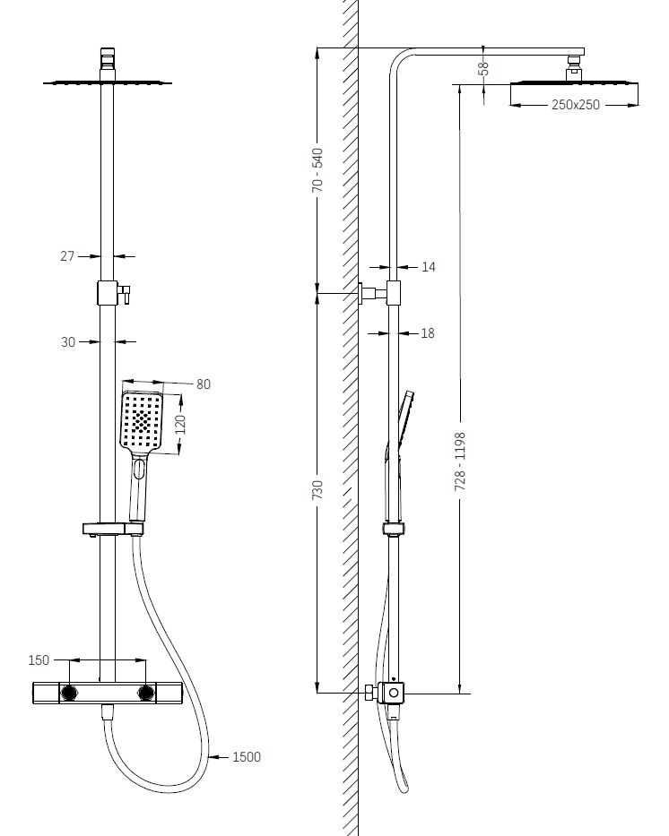 • Душ колона и горен душ от неръждаема стомана с PVD покритие.
