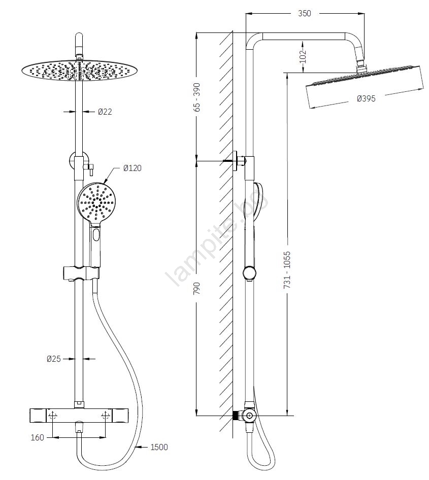 • Душ колона и горен душ от неръждаема стомана с PVD покритие.