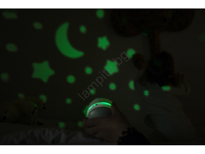 • Сензорът за плач автоматично активира проектора при засичане на плач, като включва червена светлина и музика.