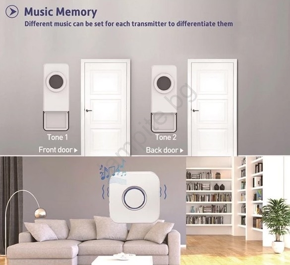 • Голямо предимство на звънеца е, че запомня мелодията и настройката на силата на звука дори след изваждане на батериите от приемника.