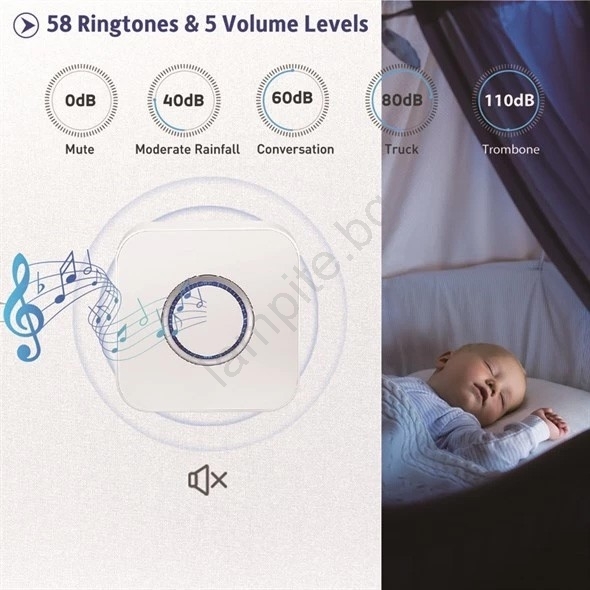 • Звънецът има семпъл модерен дизайн, 5 нива на силата на звука, избор от 58 мелодии и светлинна индикация за звънене.