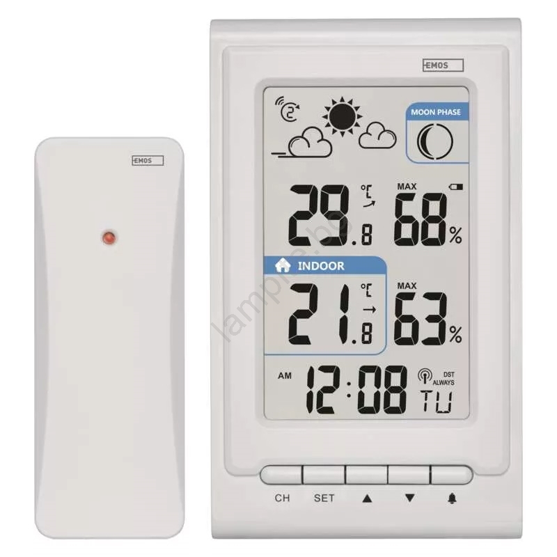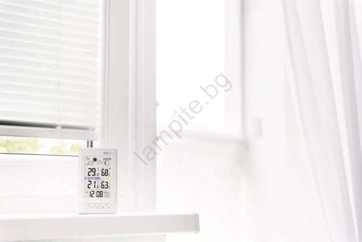 • Показва информация: вътрешна и външна температура, влажност, показване на времето, часовник, фаза на луната, дата и календар.