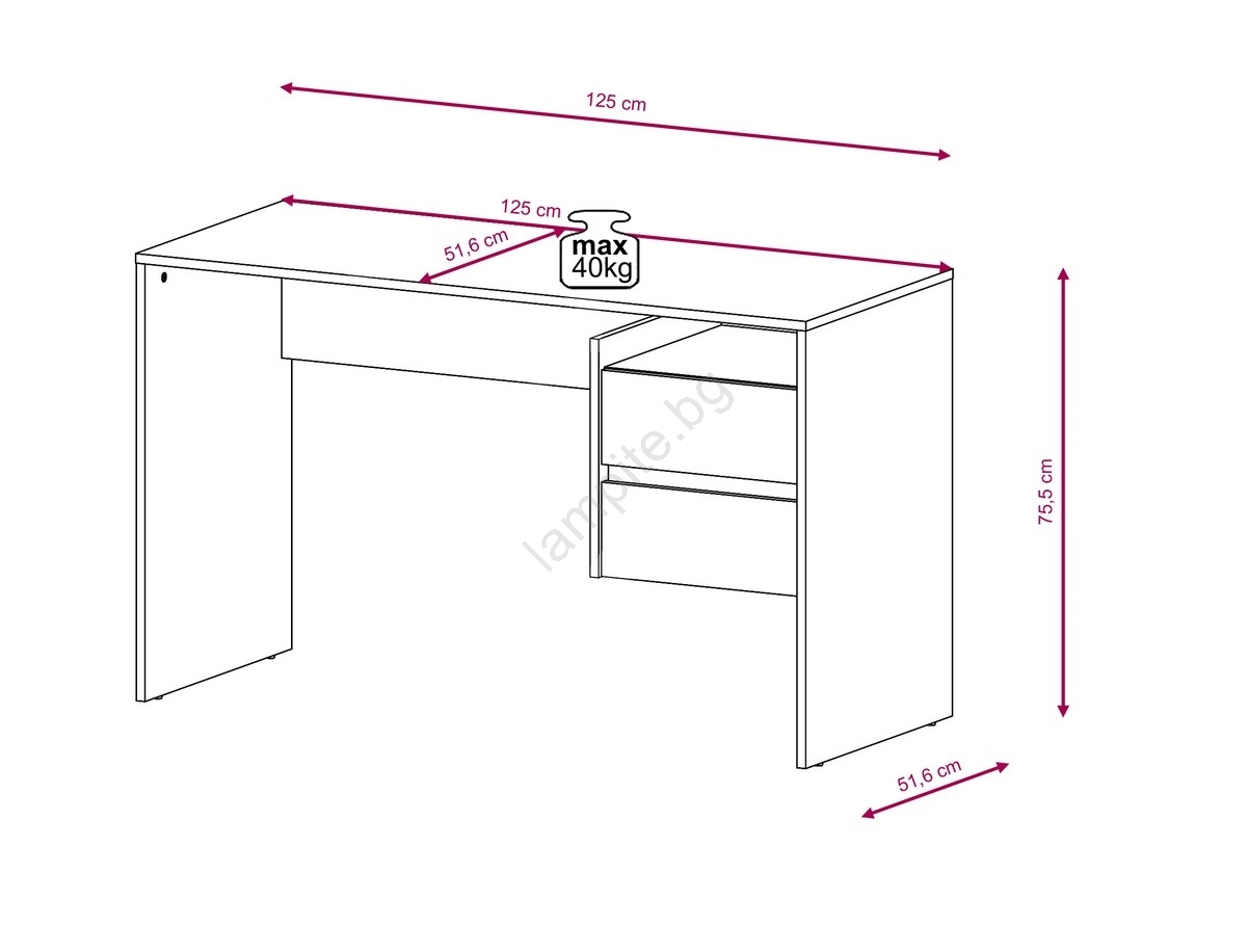 • Разполага със странична полица с два чекмеджета, идеални за съхранение на книги, офис консумативи или декорации.