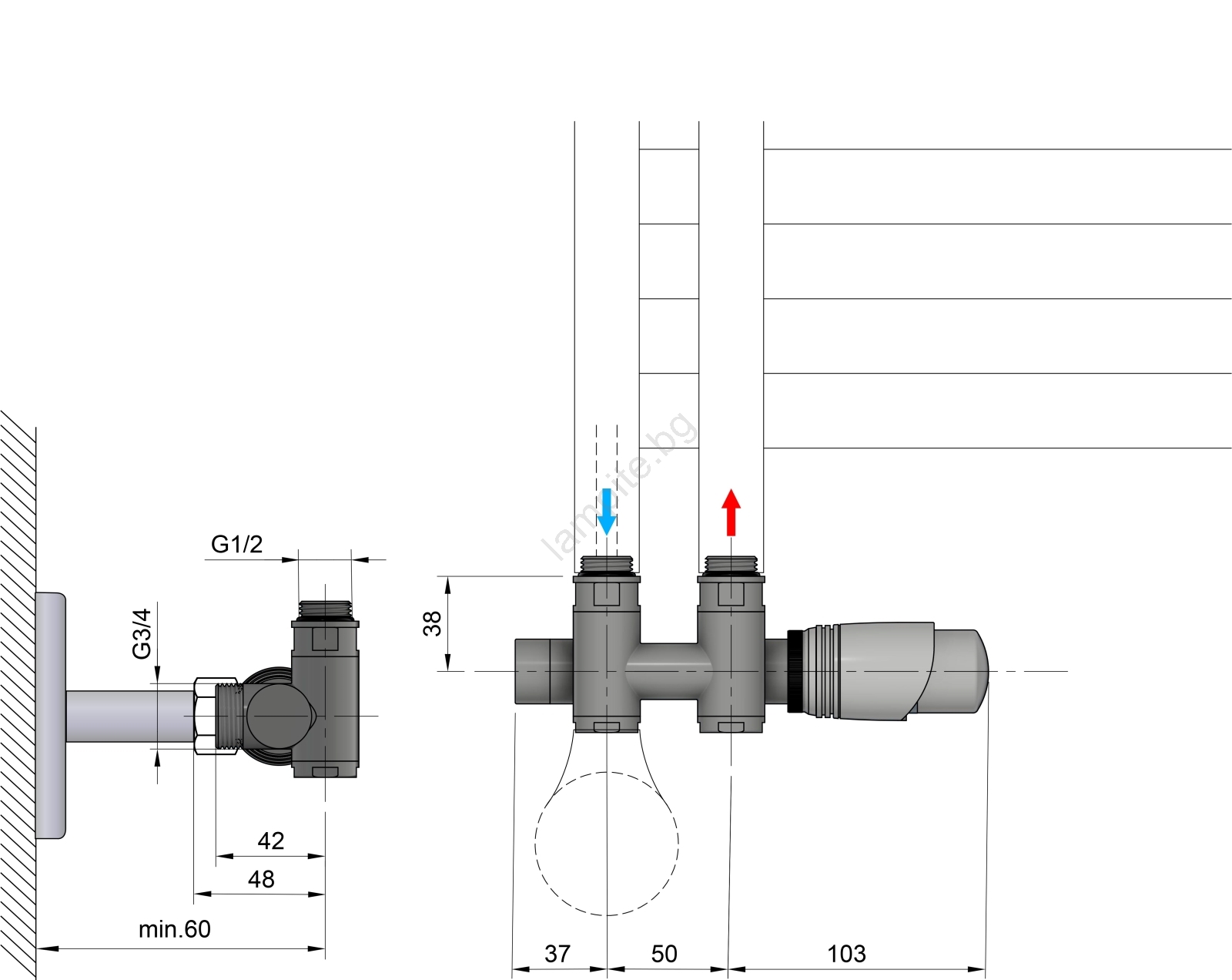 • Позволява прецизно регулиране на температурата на водата в отоплителното тяло благодарение на интегриран термостатичен вентил.