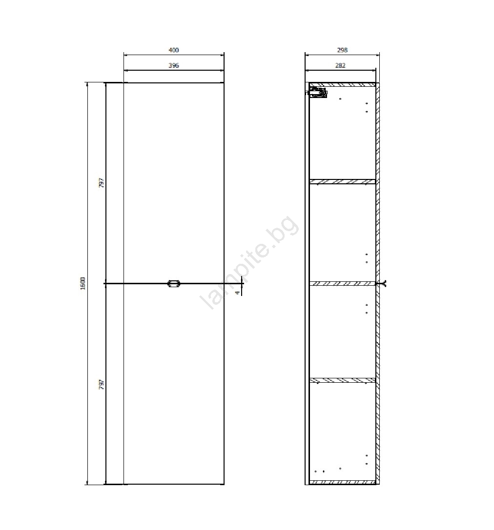 • Фронтът, корпусът и вътрешните рафтове са изработени от ПДЧ с дебелина 16 мм.