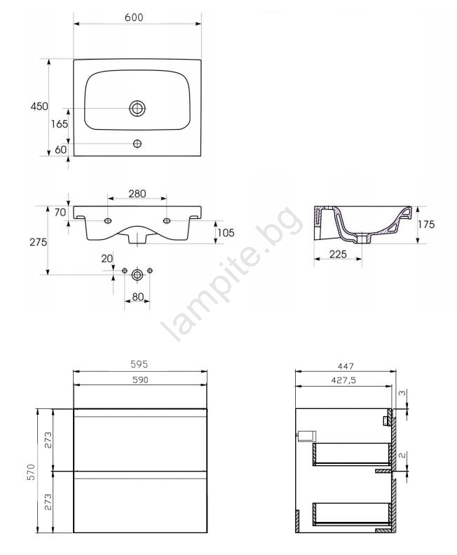 • Керамичната мивка е с класическа правоъгълна форма, с отвор за батерия и преливник.