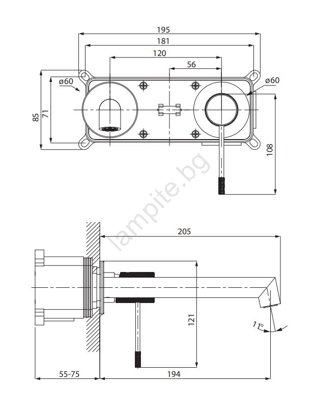 • Едноръкохватков смесител за мивка за вграждане в стена.