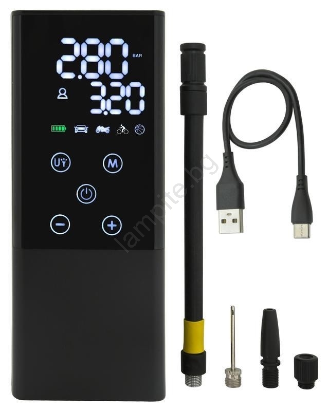 • Преносим акумулаторен въздушен компресор с компактен дизайн, сензорно управление, функция Auto-stop и собствена памет за предварително зададени стойности.