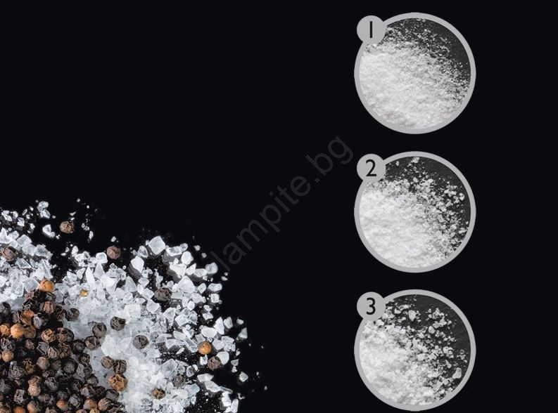 • За постигане на фино до грубо смилане, просто завъртете пръстена на една от шестте (пипер) или трите (сол) предварително зададени грубости.