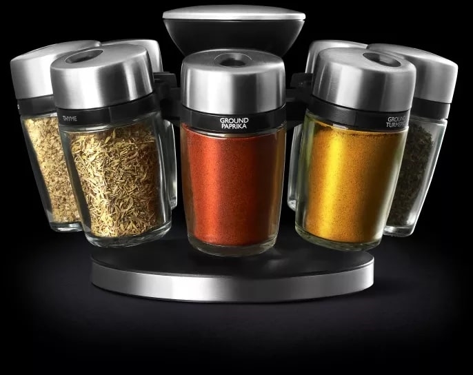 • Поставката, пълна с подправки, е разположена върху въртяща се основа, която осигурява лесен достъп до подправките.