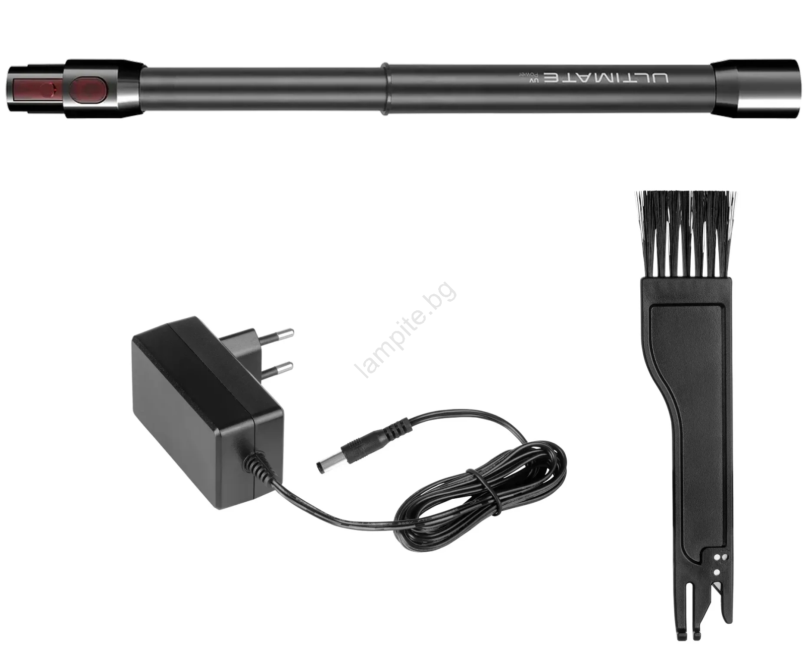 • Принадлежности в комплекта: гъвкав накрайник в горната част на прахосмукачката, малка турбо четка с UVC лампа, четка HardFloor, четка Carpet, гъвкав маркуч, щелинна дюза, щелинна дюза с четчица, дюза за тапицерия, захранващ адаптер.