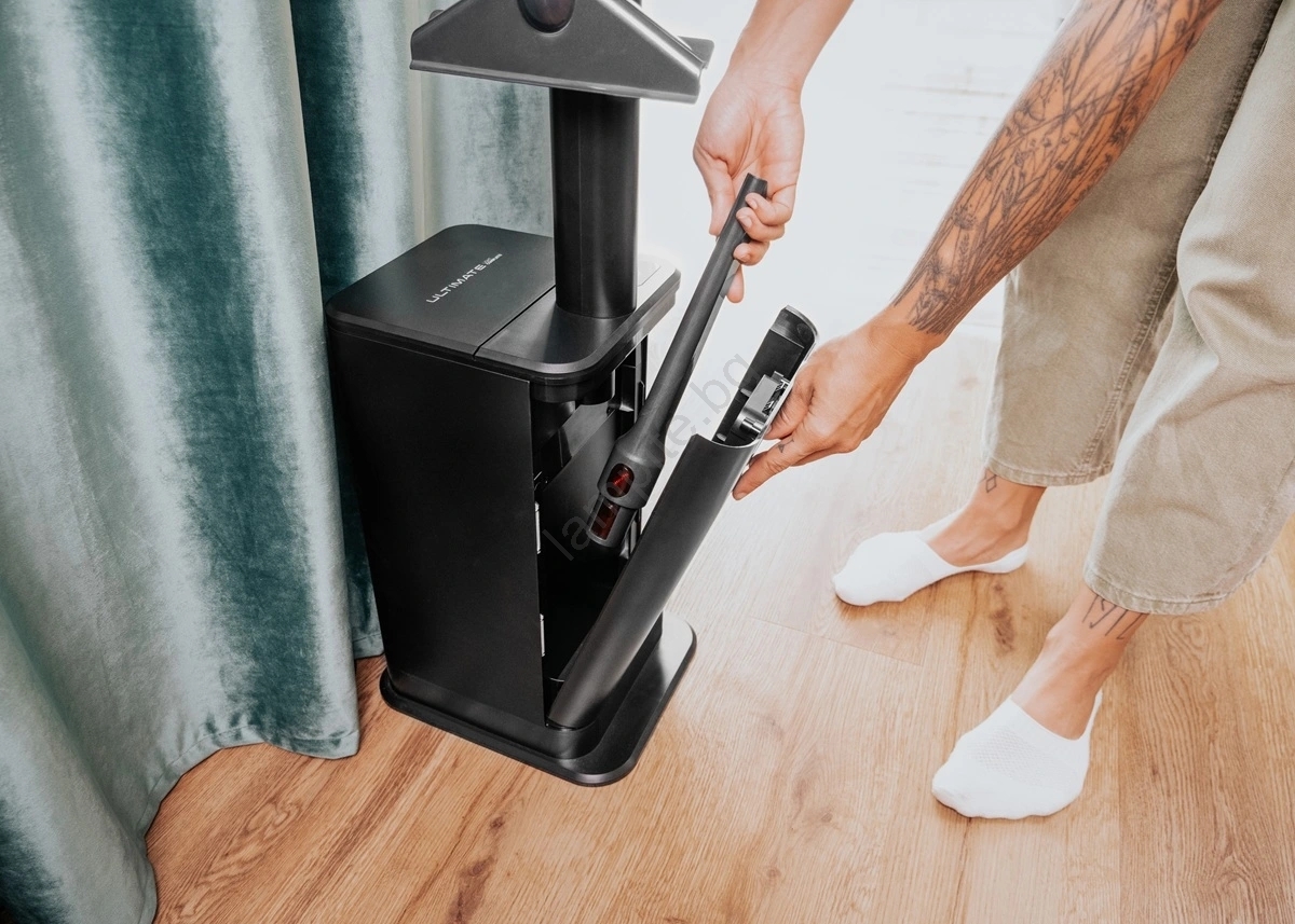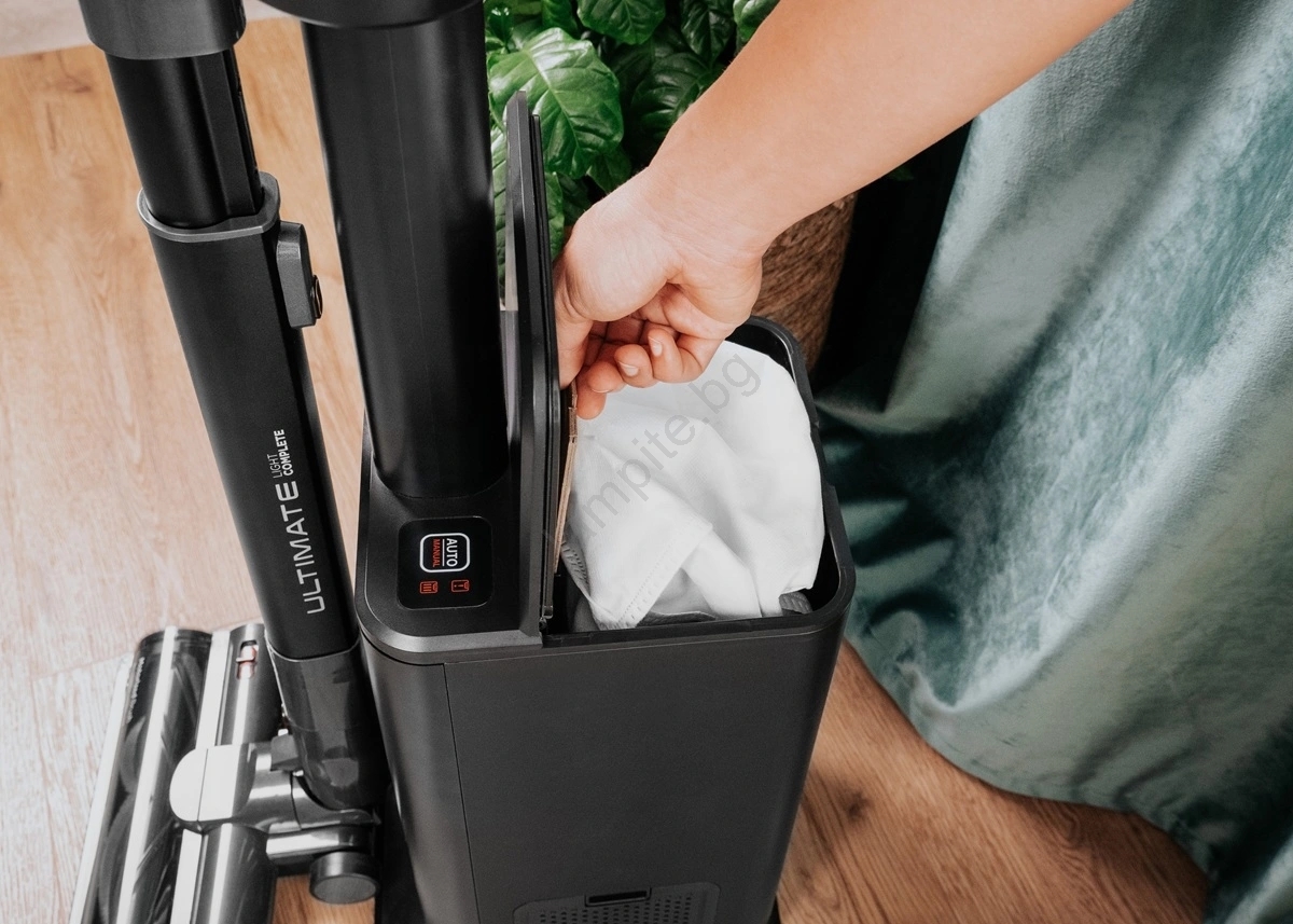 • Мултифункционалната станция хигиенично изсипва замърсяванията в торбичка с обем 3,8 л, без прахът да се връща обратно във въздуха.