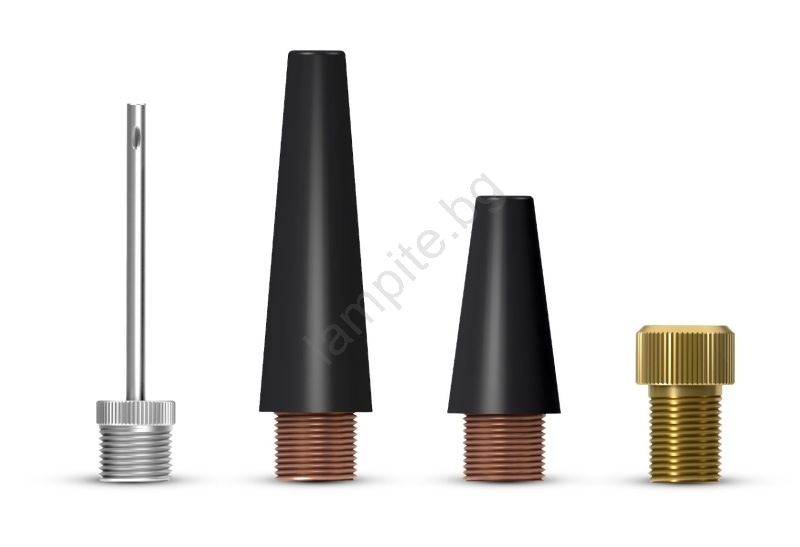 • 4 адаптера с различни размери: адаптер за вентил Presta, иглен адаптер за топки, къс конусовиден адаптер, дълъг конусовиден адаптер.
