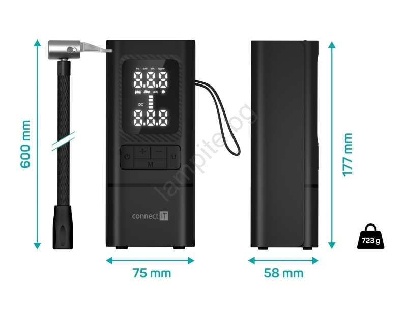 • Компресорът разполага с голям LED дисплей, който показва нивото на заряда на батерията, избрания предварително режим, целевото налягане и текущата стойност на налягането.