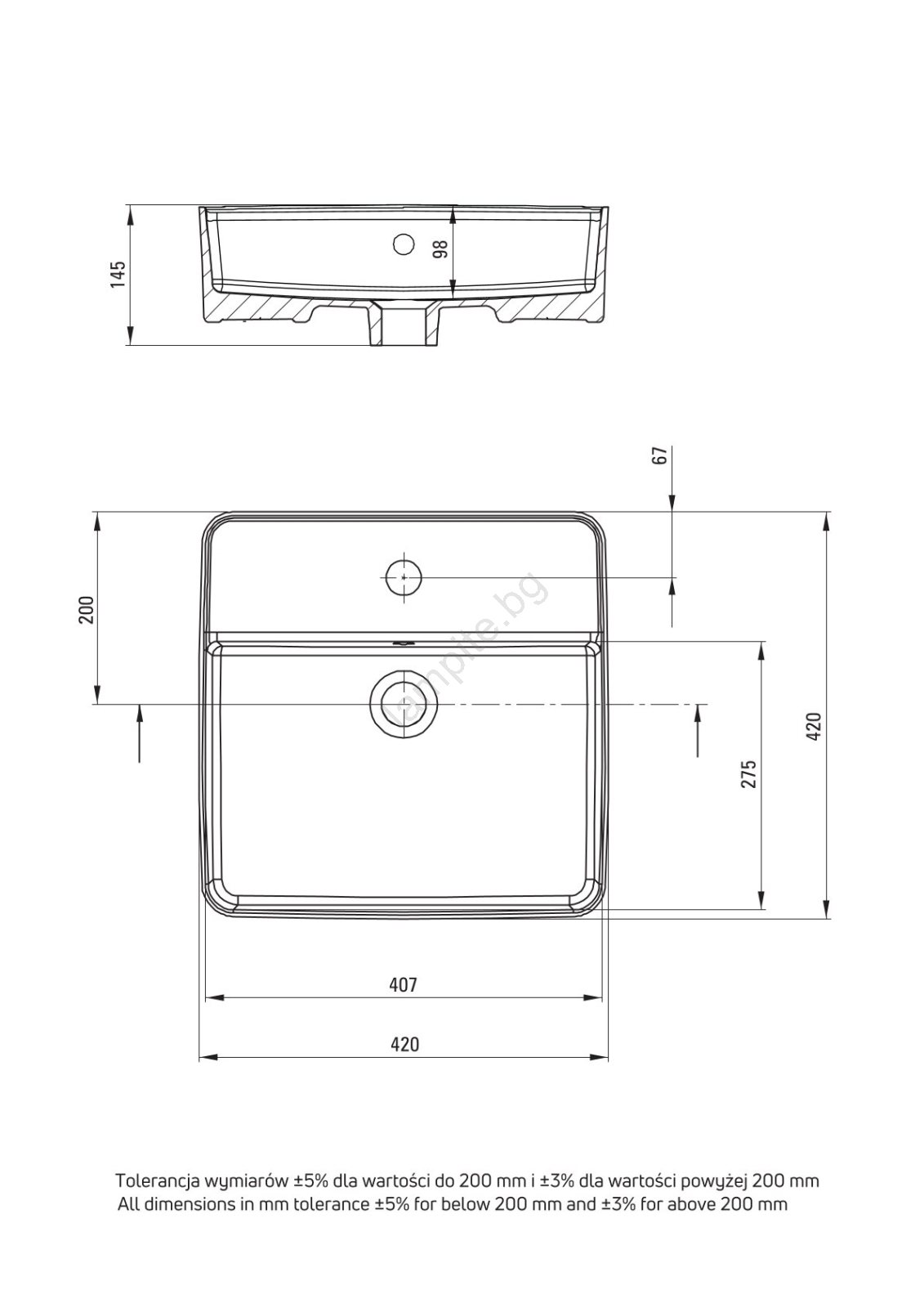 • Мивката е предназначена за монтаж върху плот, което позволява гъвкаво позициониране и съчетаване с различни видове плот за баня.