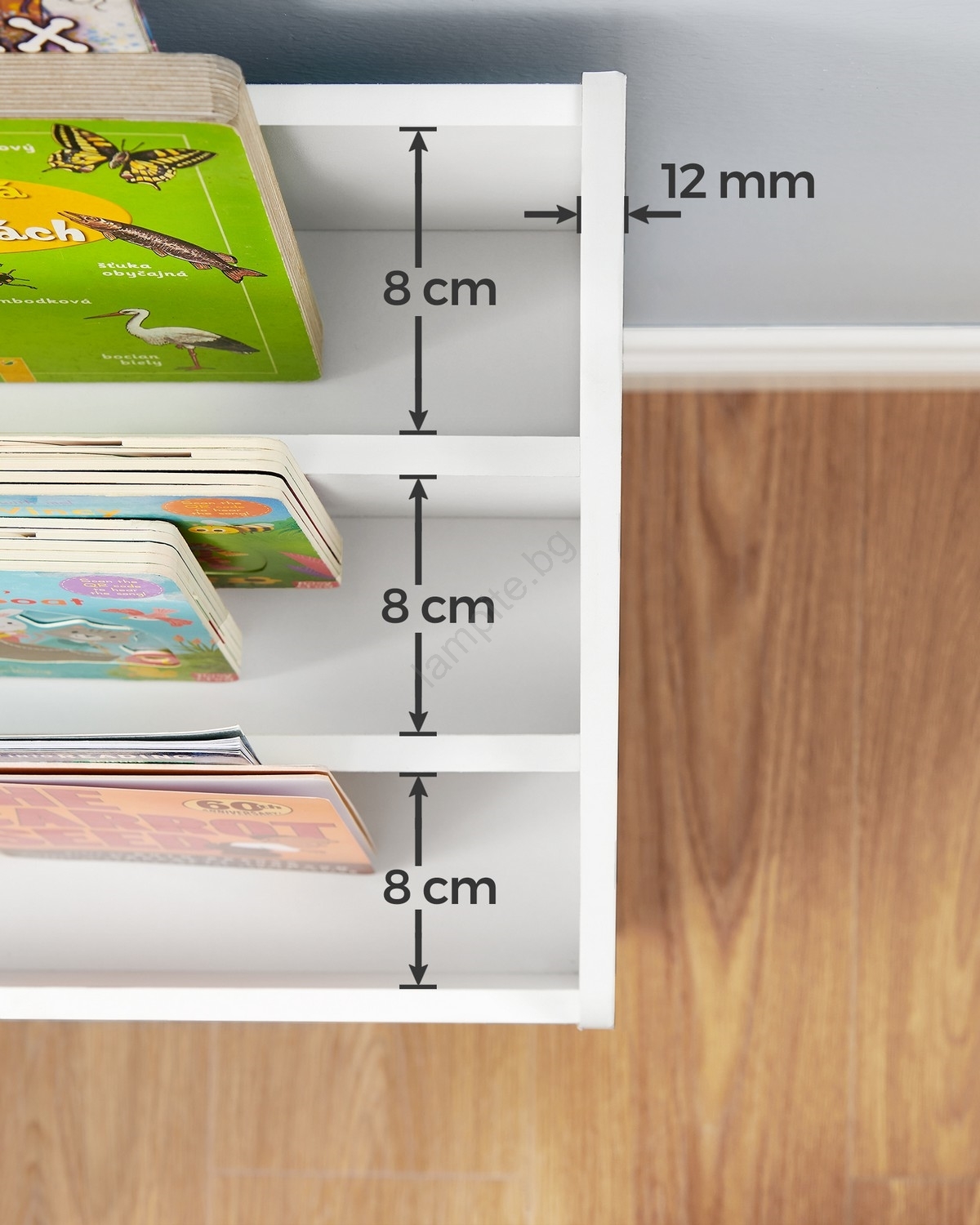 • Разполага с 3 просторни отделения за книги и голямо чекмедже за лесно съхранение на играчки и книги.