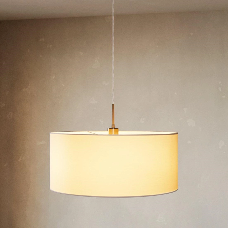 • Външният вид на осветителното тяло е подчертана от абажур, изработен от бял текстил, допълнен с метален корпус.