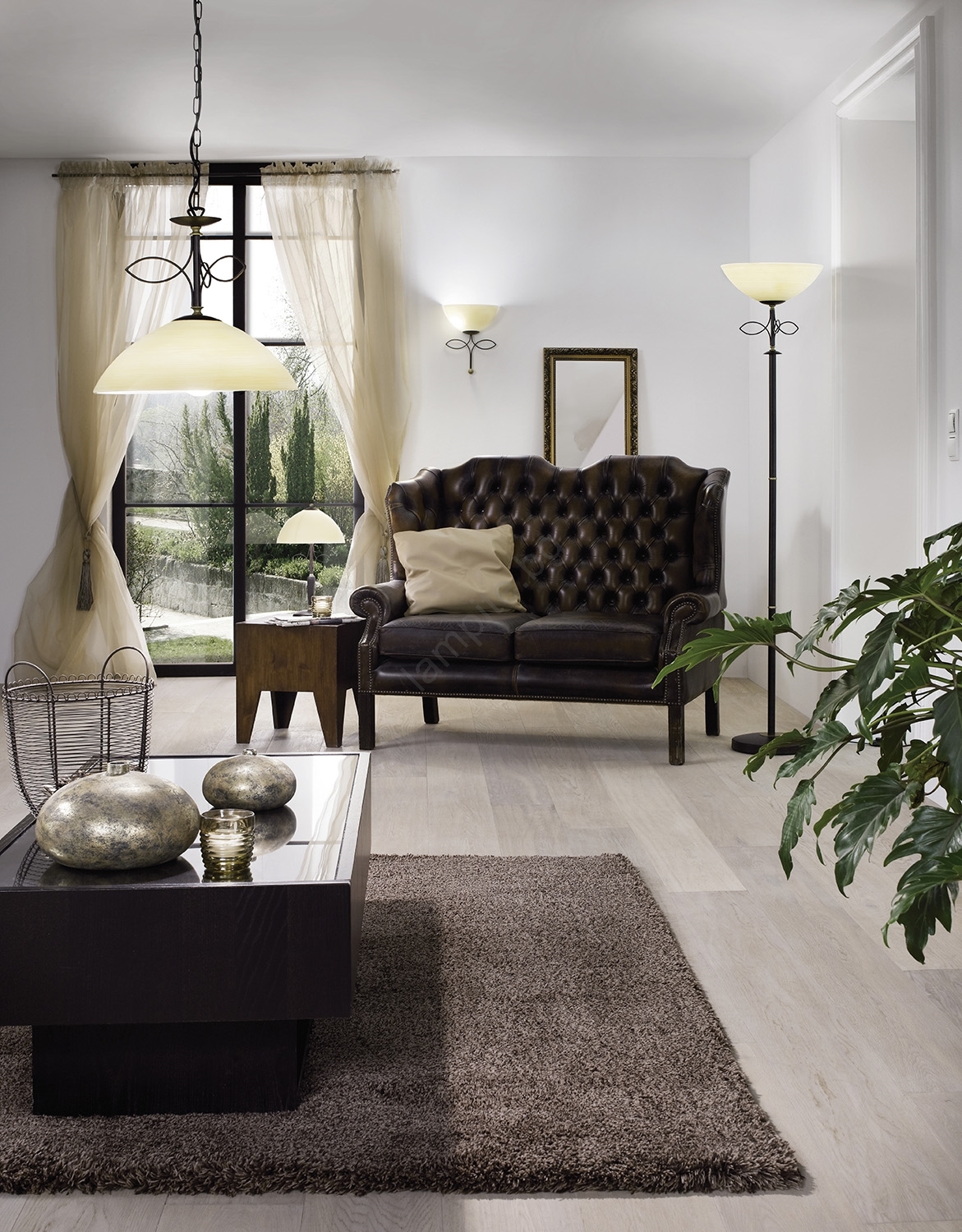 Изработено е от метал и стъкло, конструкцията на осветителното тяло е в антично кафяво изпълнение, а абажурът е в бял цвят. Яркото осветление осигурява една крушка, която се продава отделно.