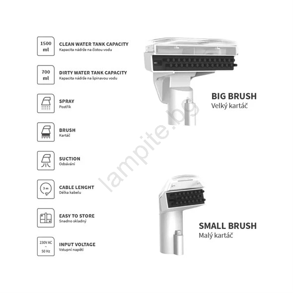 • Подходящ е за задълбочено почистване на килими, тапицирани мебели, матраци и интериори на автомобили.