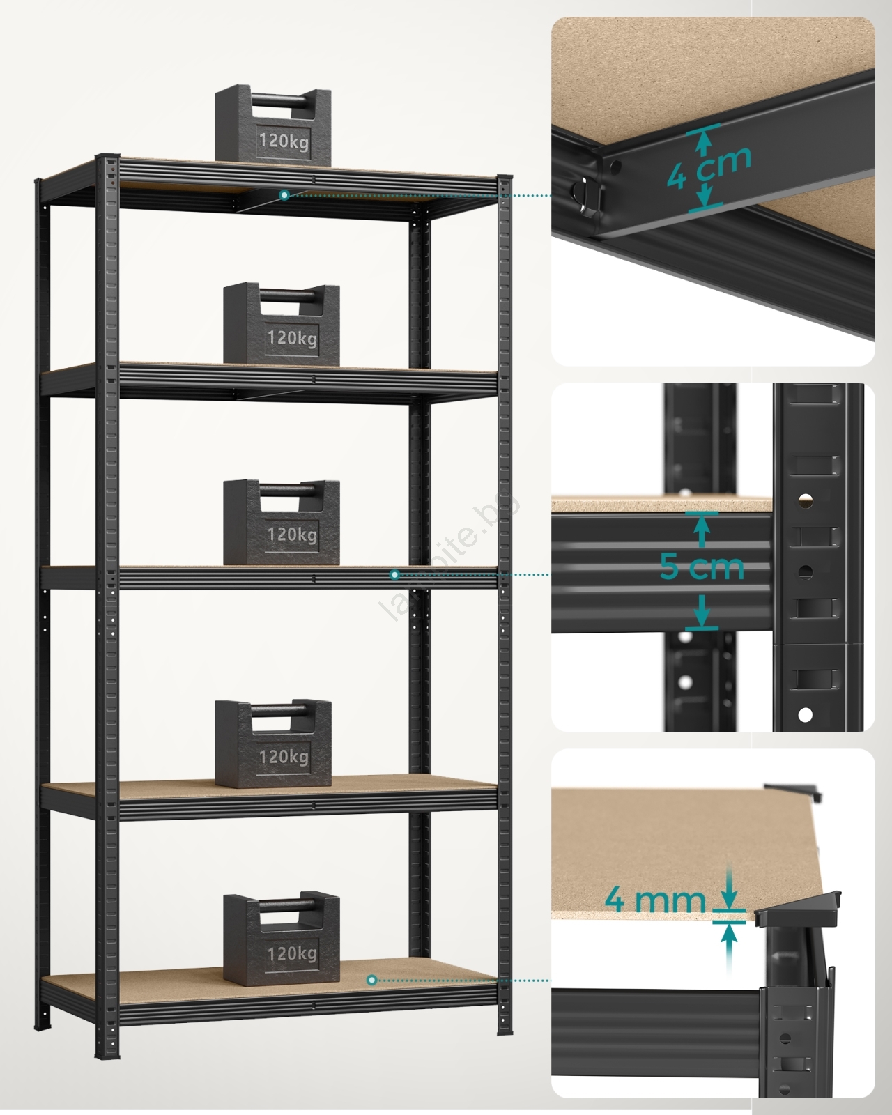 • Всяка полица издържа до 120 kg и може безопасно да побере бои, инструменти и фитнес оборудване.
