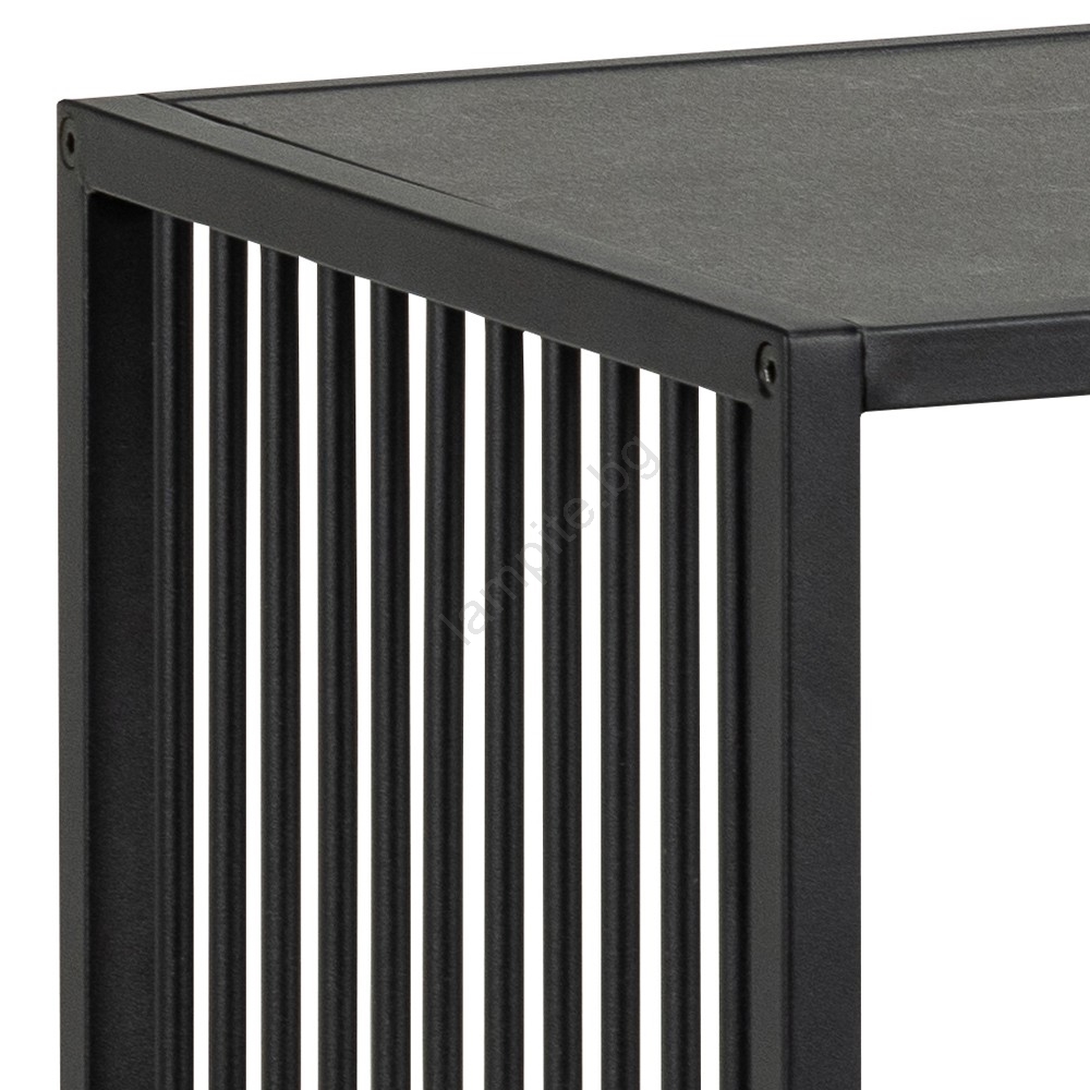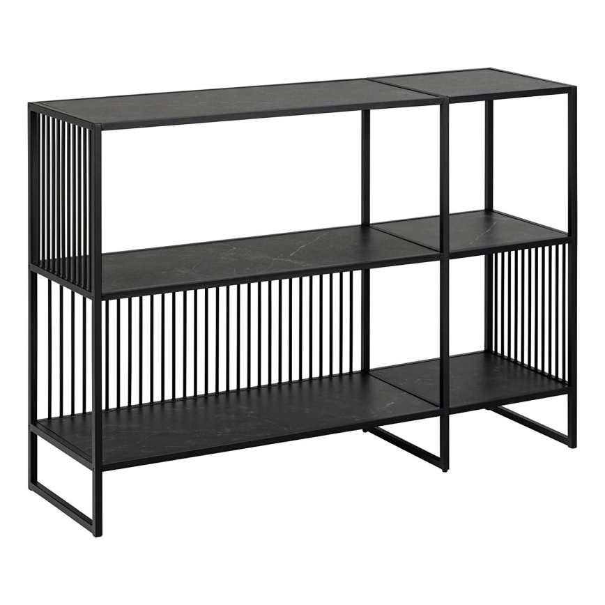 • Рамка и основа от матово черна, грубо прахово боядисана стомана, 2 рафта от матово черен Измир с груб меламин.