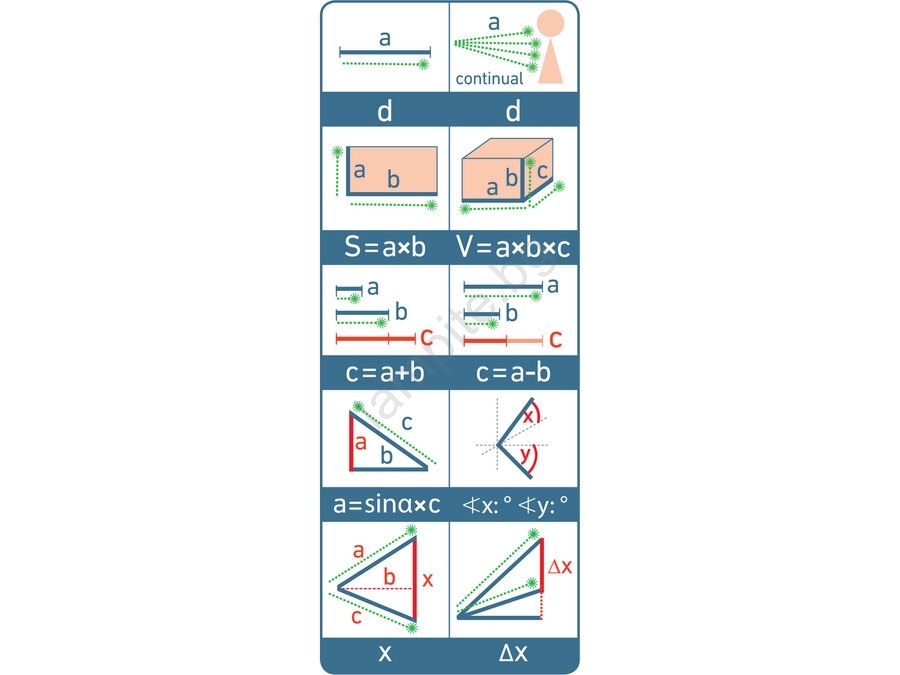 • Функции на измерване: разстояние с възможност за непрекъснато измерване (min./max. стойности), площ, обем, допълнително изваждане/събиране към вече измерени стойности, непреки измервания (изчисление) с помощта на гониометрични изчисления и измерване на ъгъл (3 изчисления с използване на една референтна точка), функция наклономер - измерва наклона както в хоризонтална, така и във вертикална равнина (°x /°y).