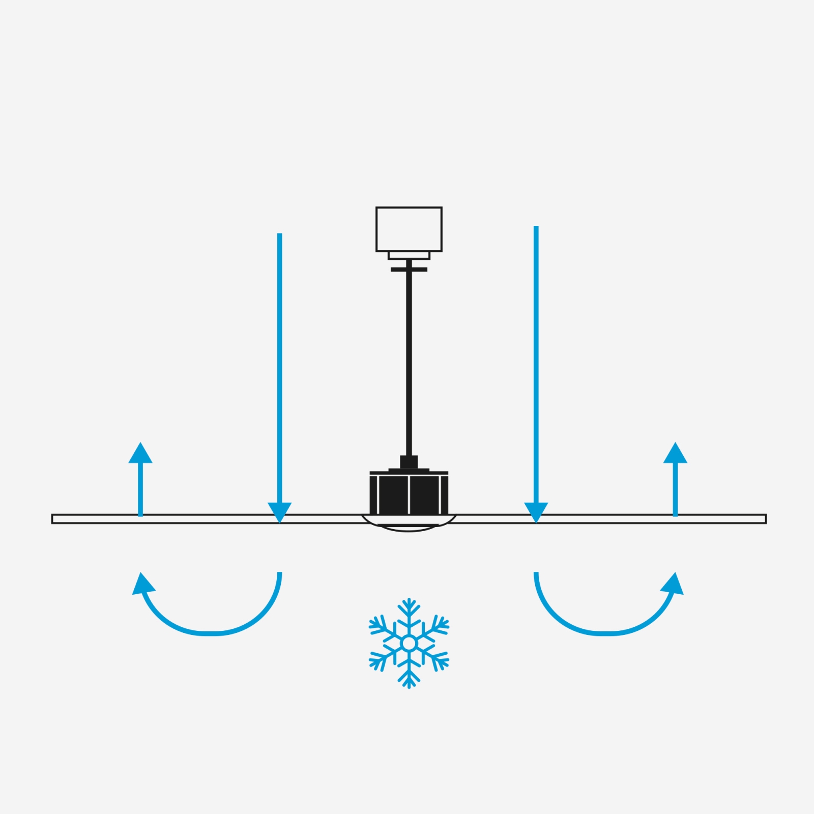 • Този вентилатор разполага с функция за обратен ход лято-зима, което позволява използване и през зимата (спестяване на разходи за отопление до 20 %).
