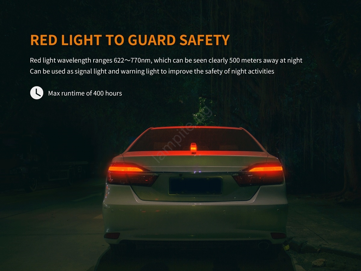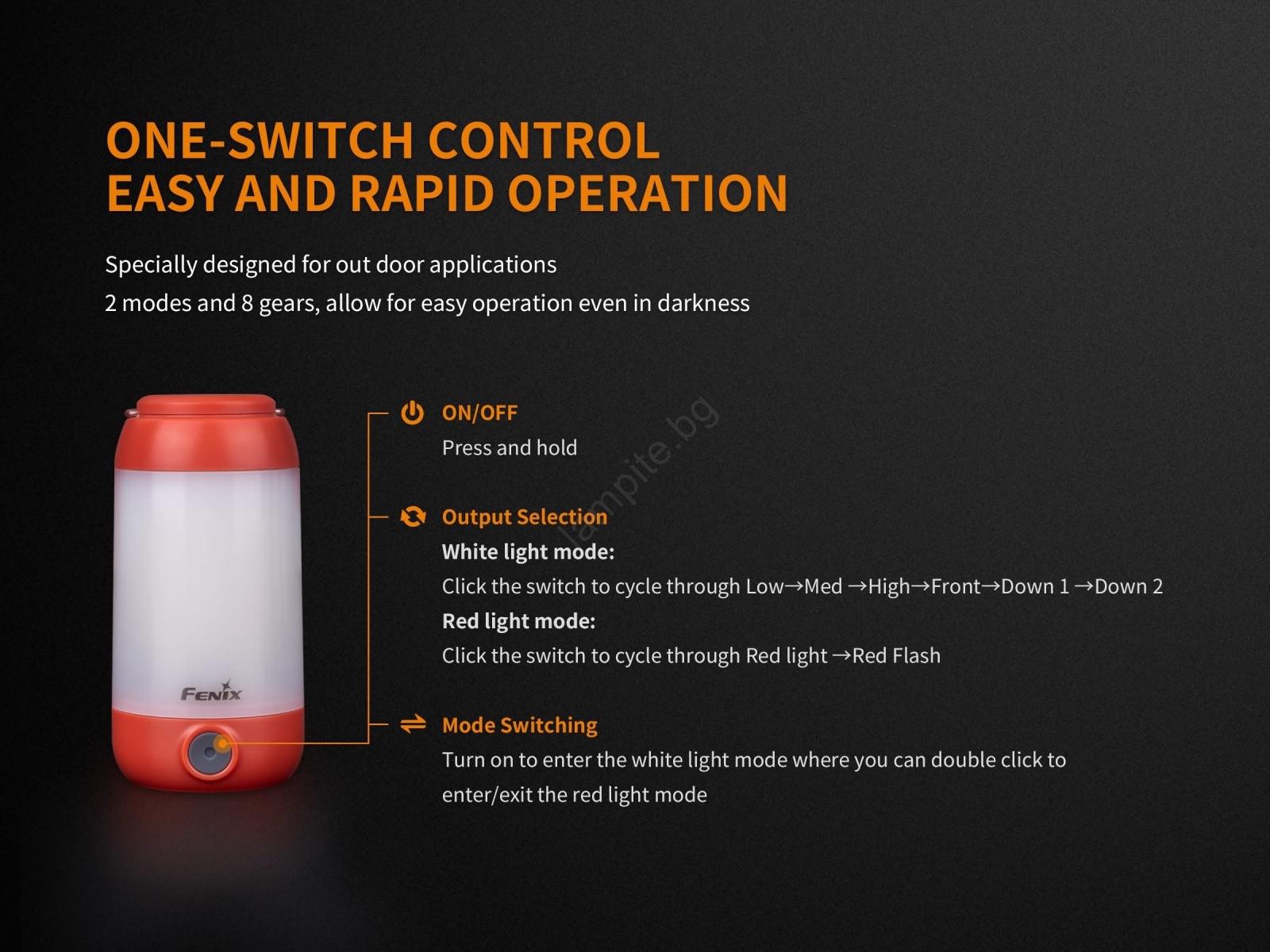 • Осем режима на мощност: 400 лумена (5 часа) -> 150 лумена (15 часа) -> 40 лумена (30 часа) -> странично осветление 25 лумена (58 часа) -> долно осветление 3 лумена (240 часа) -> долно осветление 25 лумена (58 часа) -> червени LED 1 лумен (200 часа) -> червено мигане 1 лумен (400 часа).