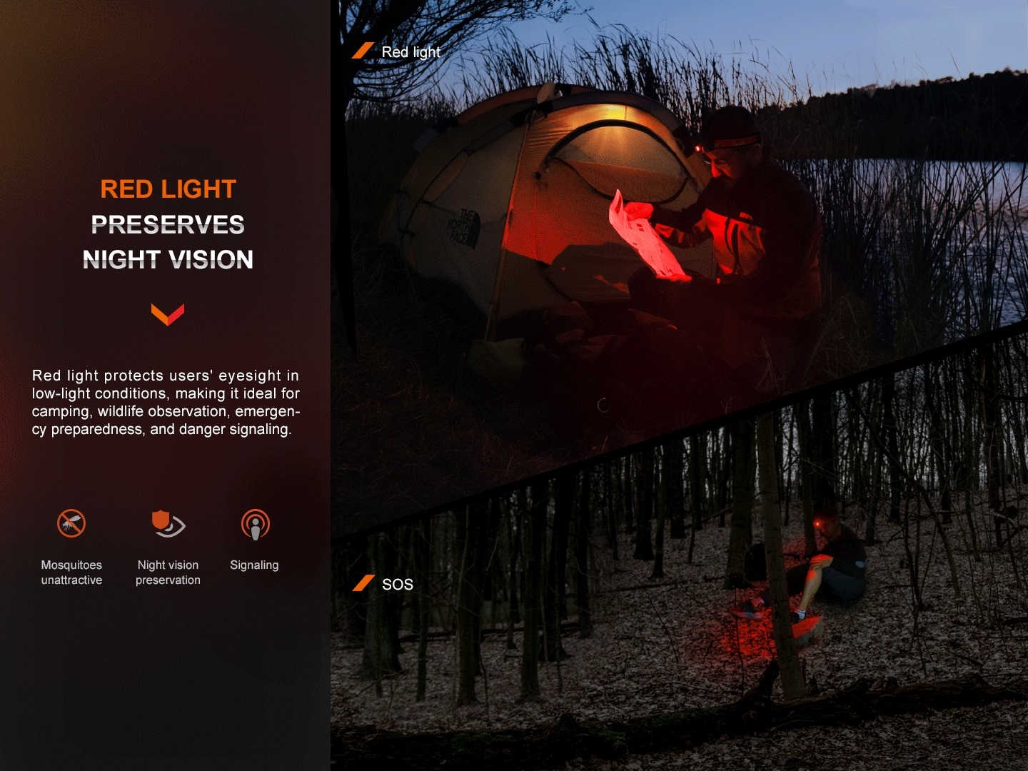 • Два режима на червена светлина: 5 лумена (100 часа) -> SOS 5 лумена (200 часа)