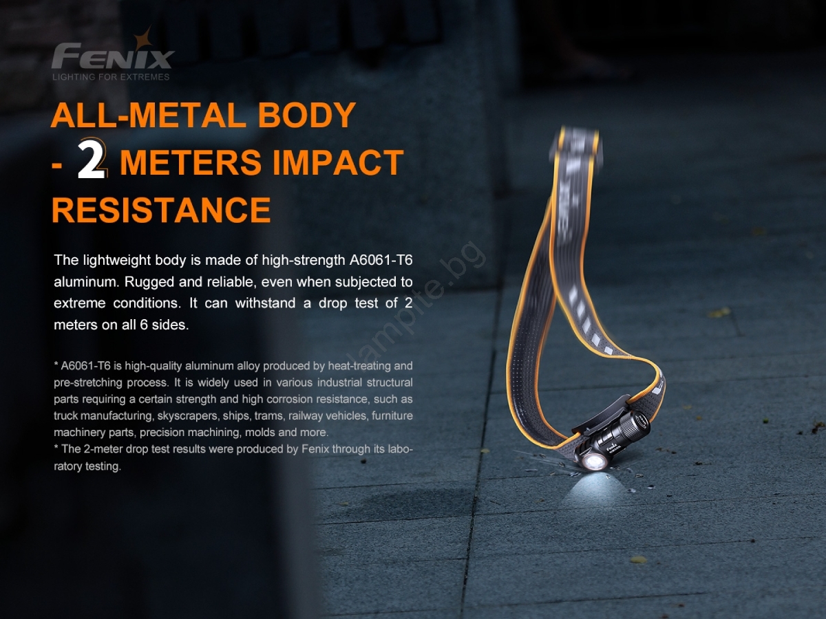 • Челната лампа е удароустойчива при падания от височина 2 метра, прахоустойчива и водоустойчива (потапяне до 2 м).