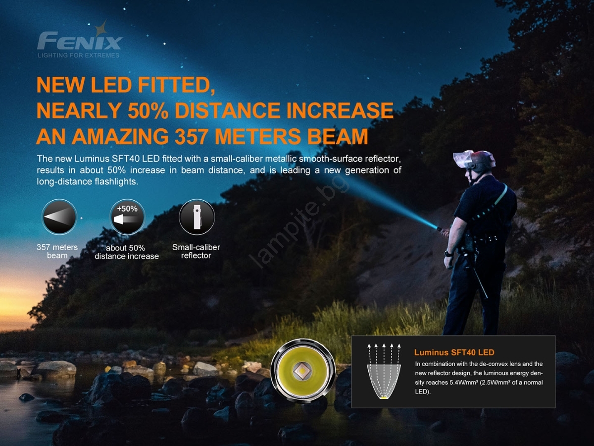 • В комплекта са включени каишка за китка, калъф за колан, резервни уплътнителни пръстени, акумулатор Fenix 18650 2600 mAh с USB и micro USB заряден кабел.