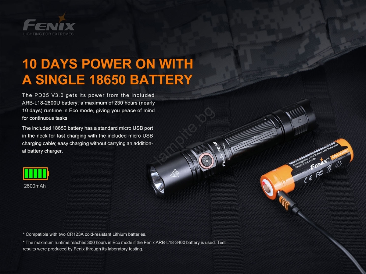 • Захранване: Li-ion акумулатор 18650 с капацитет 2600 mAh (включен в комплекта) или 2x CR123A (не са включени в комплекта).