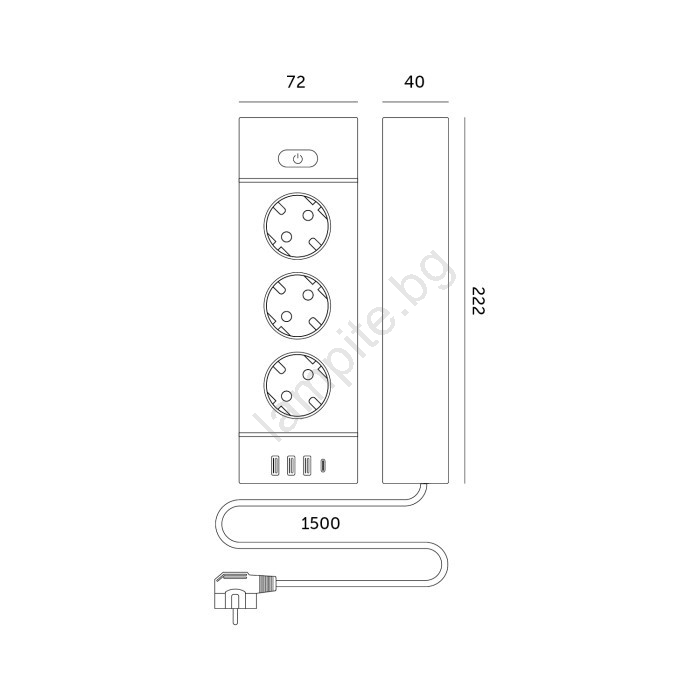 • Брой гнезда: 3 x 230 V, 3 x USB-A и 1 x USB-C.