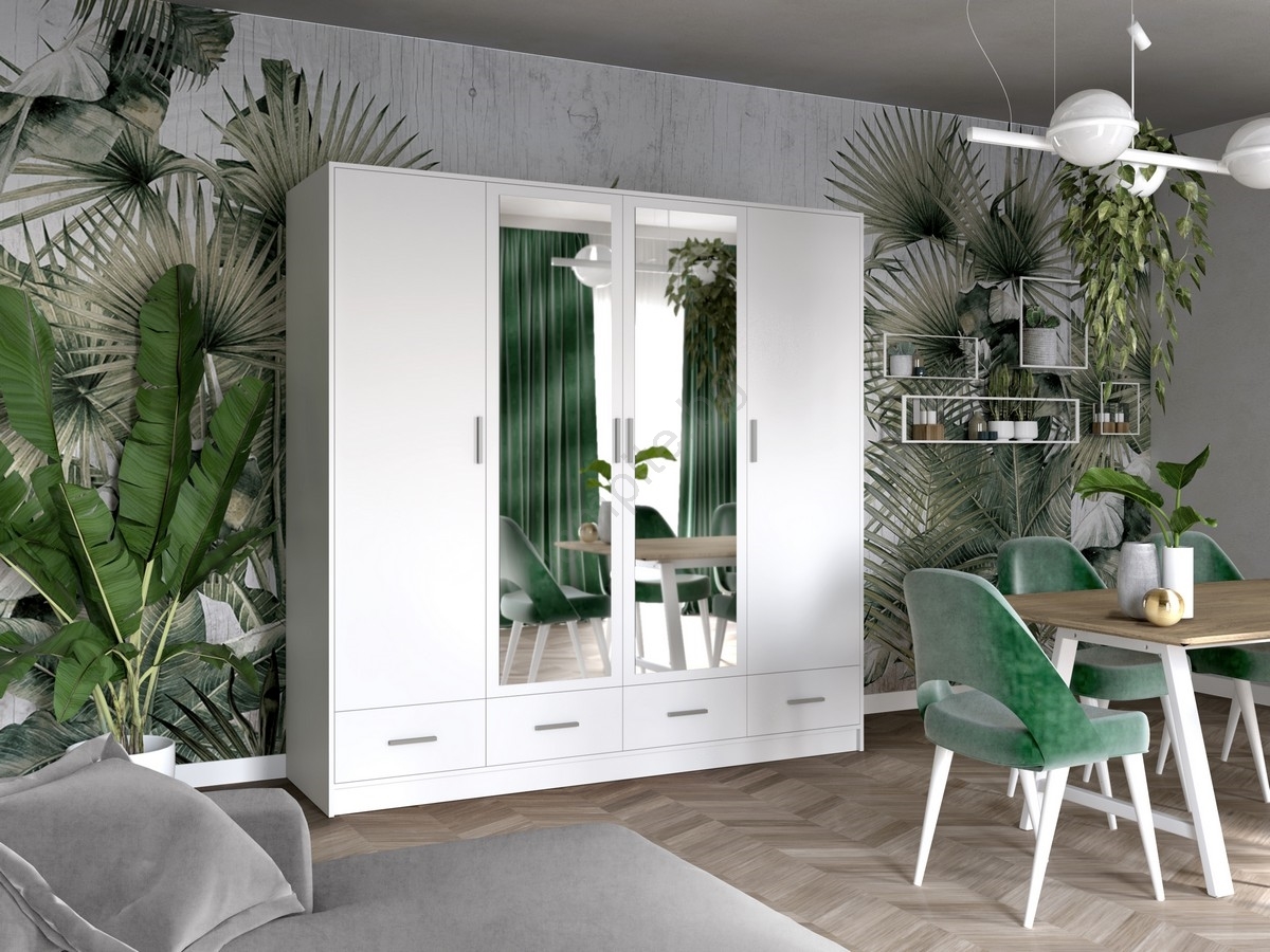 • Гардеробът разполага с 8 открити рафта, 4 чекмеджета, лост за закачалки и горен рафт за съхранение на чанти и сезонни вещи.
