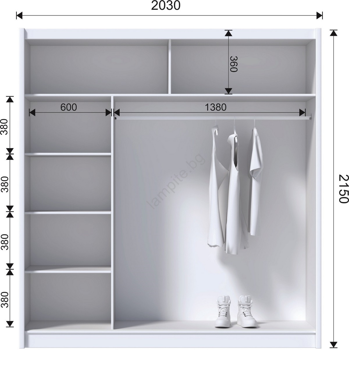 • Гардеробът разполага с 4 открити рафта, лост за закачалки и 2 горни рафта за съхранение на чанти и сезонни вещи.