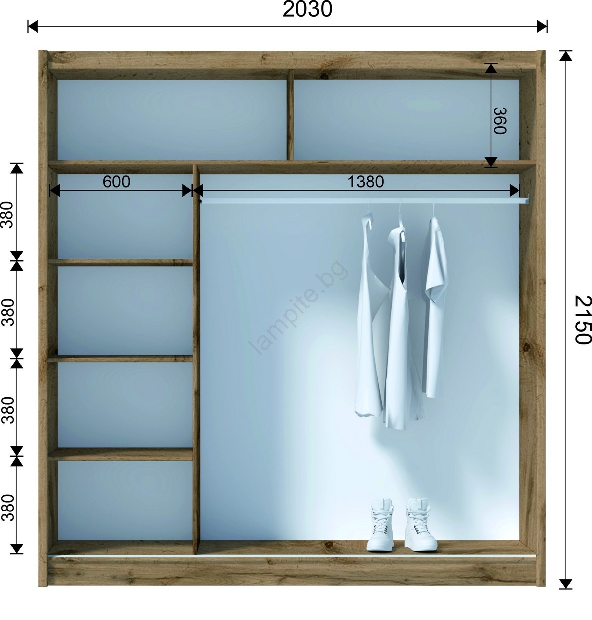 • Гардеробът разполага с 4 открити рафта, лост за закачалки и 2 горни рафта за съхранение на чанти и сезонни вещи.