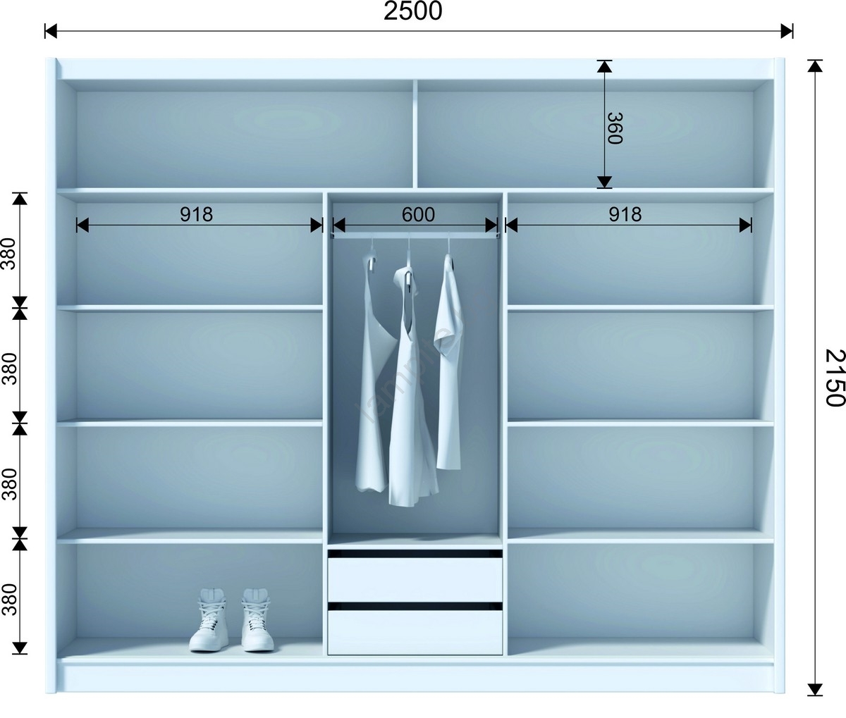 • Гардеробът разполага с 8 открити рафта, закачалка, 2 горни рафта и 4 чекмеджета за съхранение на чанти и сезонни вещи.