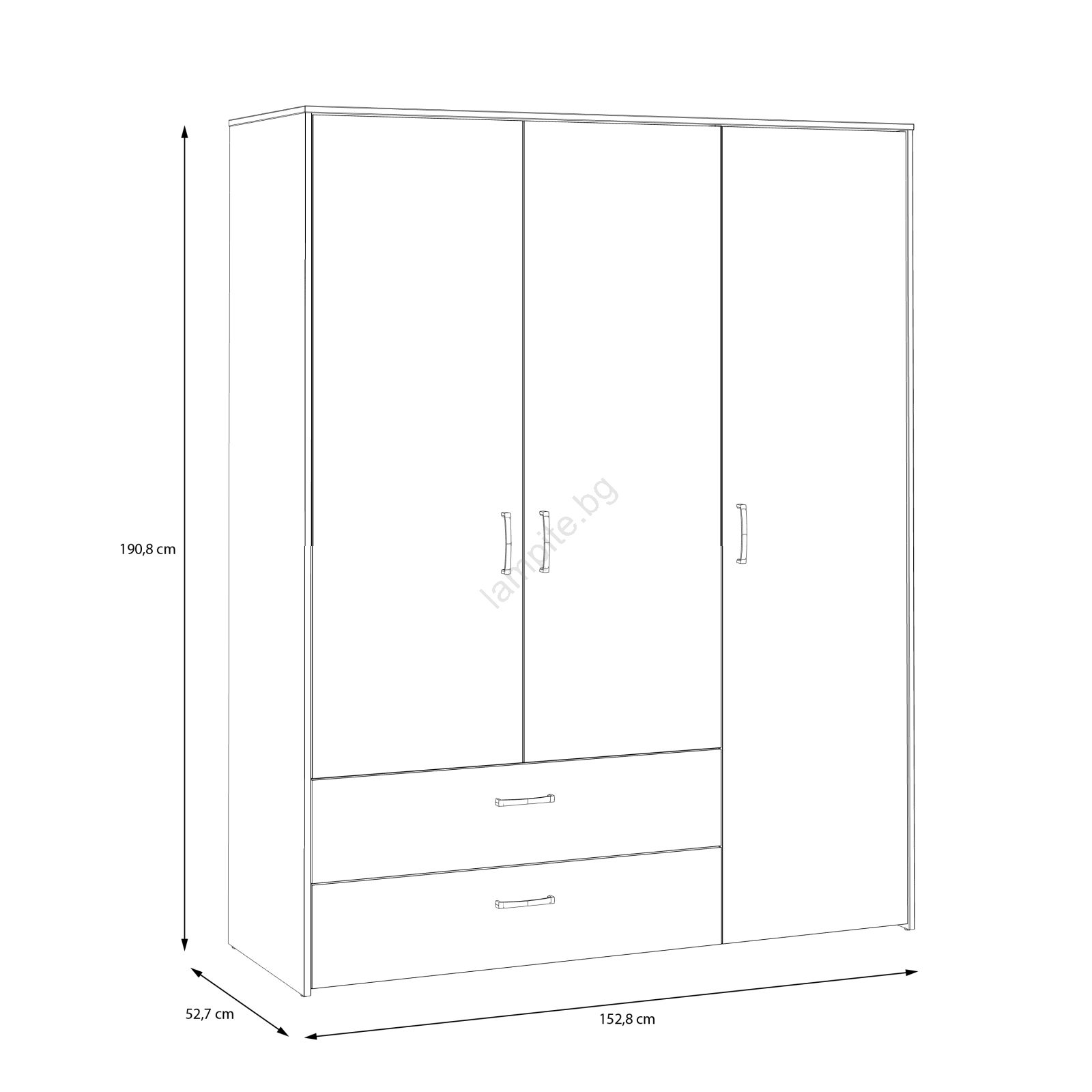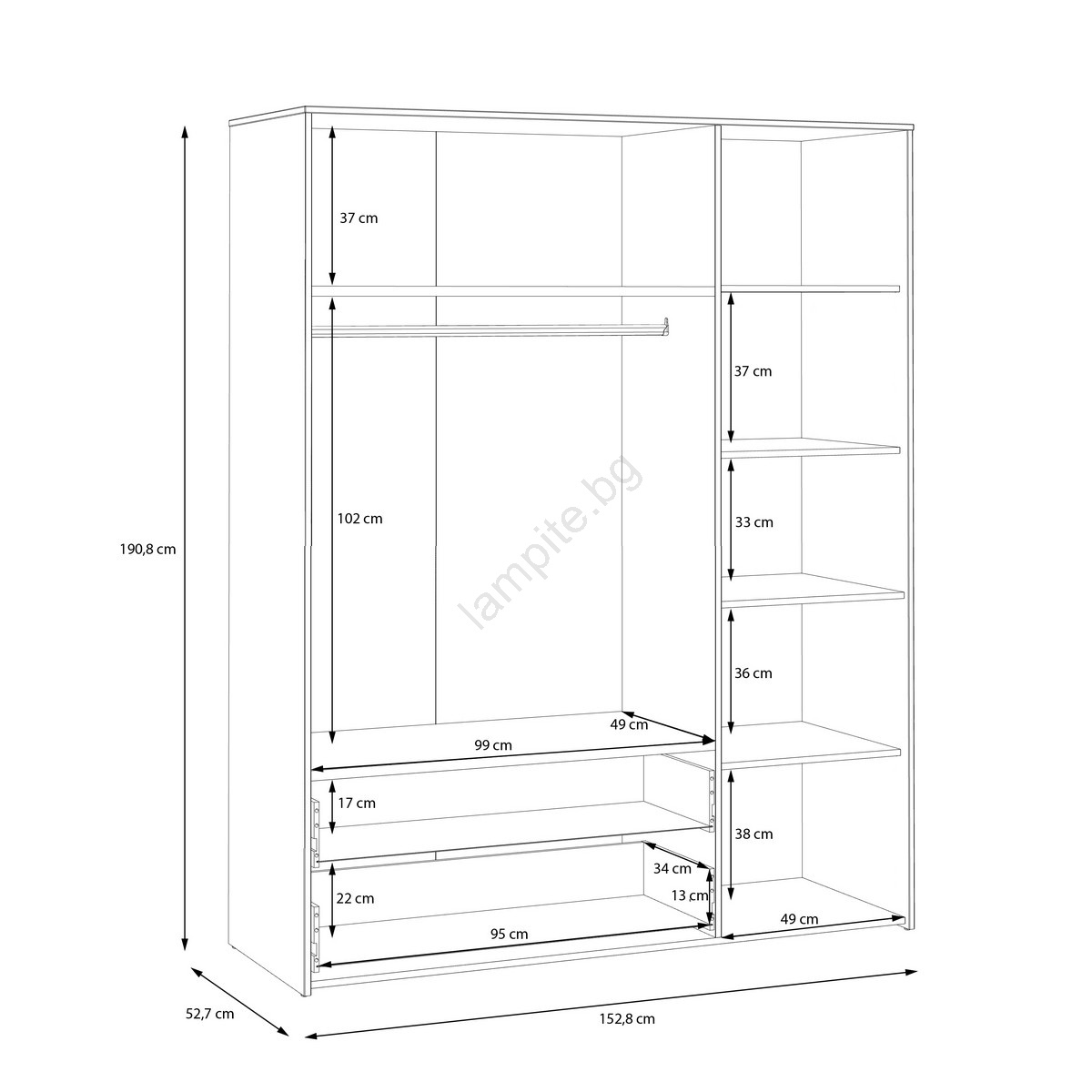 • Шкафът разполага с лост за закачалки, рафтове, чекмеджета и голямо място за съхранение за вашите дрехи, чанти и сезонни вещи.