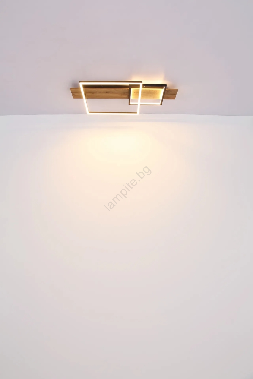 • Таванното осветително тяло комбинира матово черен метал, MDF с дървесен декор, черен алуминий и опалов дифузьор от пластмаса, което му придава модерен и елегантен вид.