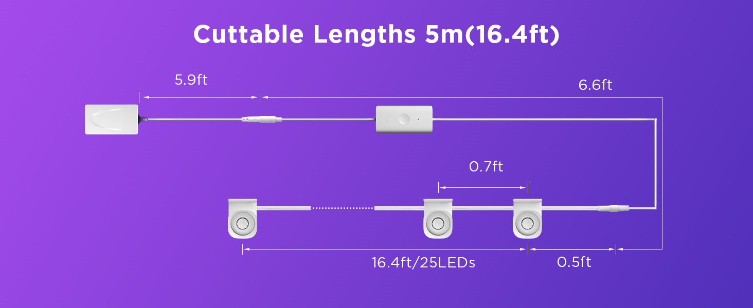 • Верига от 25 независимо програмирани LED светлини, разпределени по дължина от 5 метра, превръща скучната стена в произведение на изкуството с голямоформатна RGB проекция.