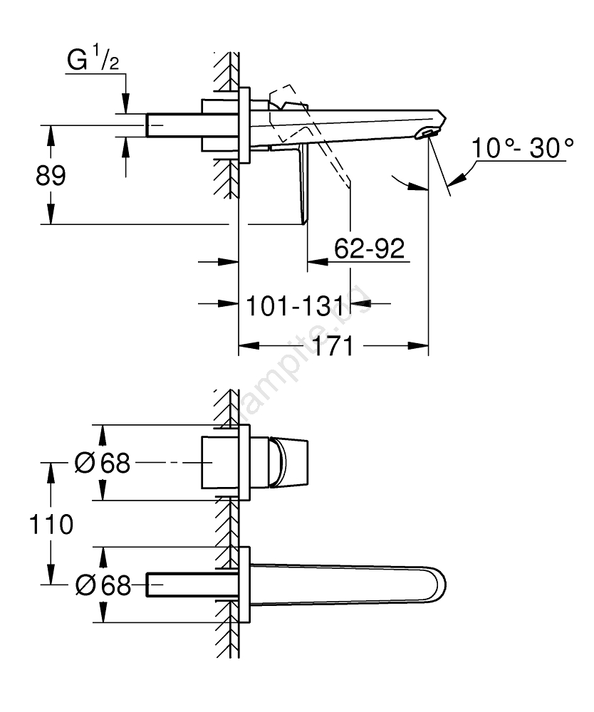 • Разстоянието от центъра на ръкохватката до излива е 110 mm, дължина на излива 170 mm.