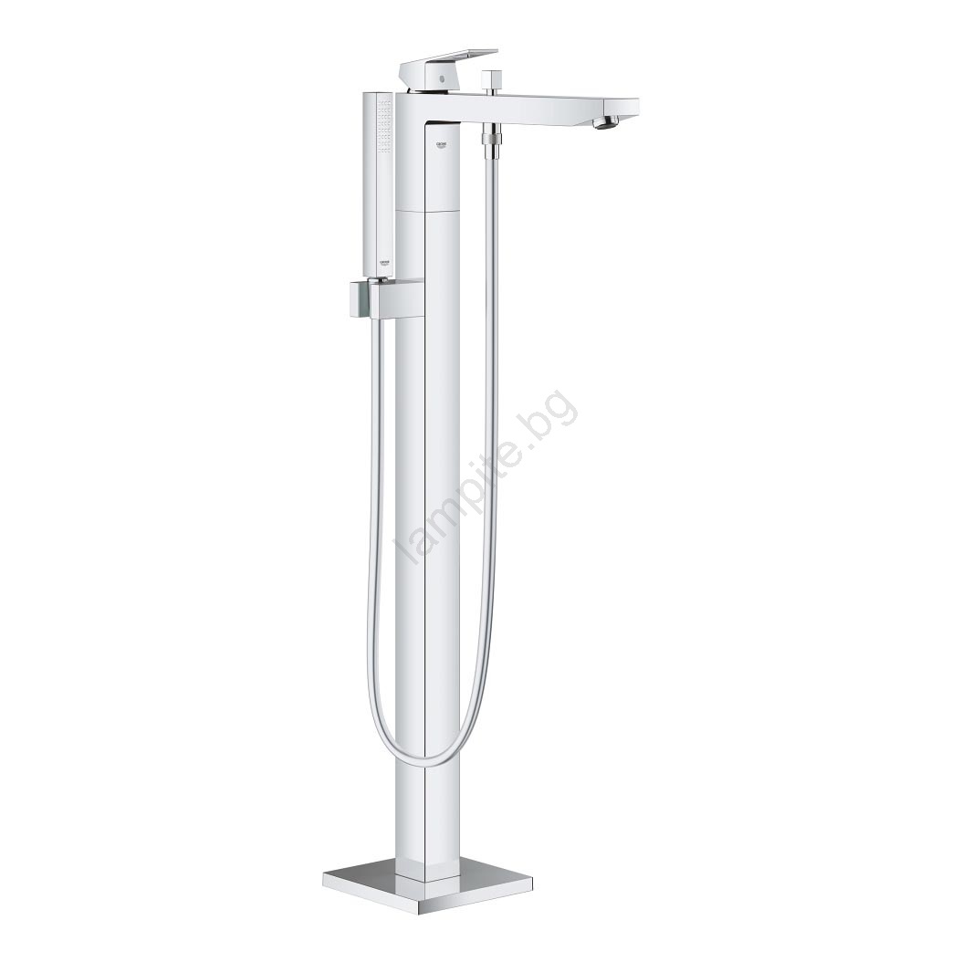 • Подов едноръкохватков смесител за вана GROHE Eurocube с модерен кубистичен дизайн за свободно стоящи вани.