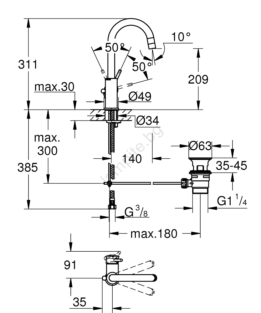 • Височина на смесителя 311 mm и дължина на излива 140 mm осигуряват достатъчно пространство за удобно ползване.