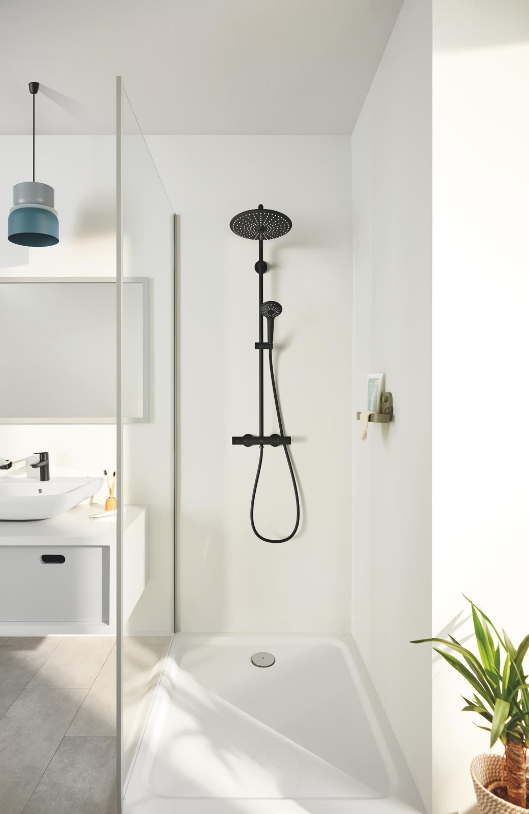 • Елегантна душ система в матово черно Phantom Black за модерен вид на банята.